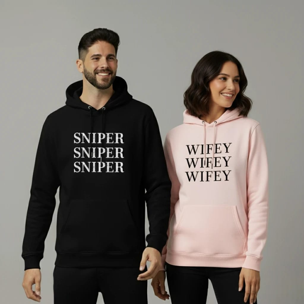 β’ Vibe: The use of "WIFEY" suggests one hoodie is for a wife or partner, while "SNIPER" likely represents the partner (perhaps the husband or boyfriend) and adds a somewhat humorous, action-oriented, or protective element to the matching set. They are a popular style of couple's apparel or personalized/custom clothing.