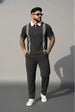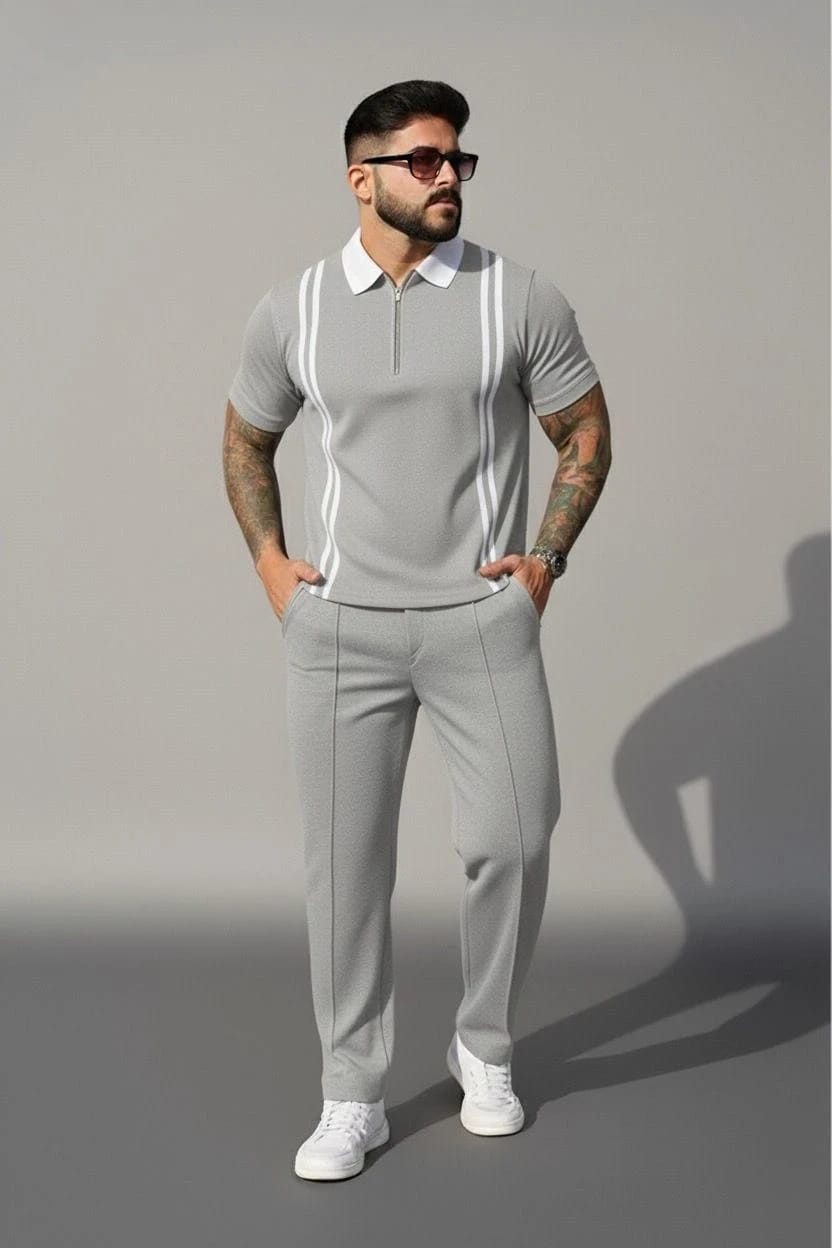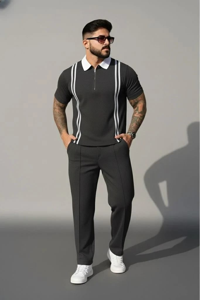 The zip-up design offers a contemporary flair, making it perfect for both casual and semi-formal occasions. Paired with tailored black trousers, the look exudes confidence and sophistication.