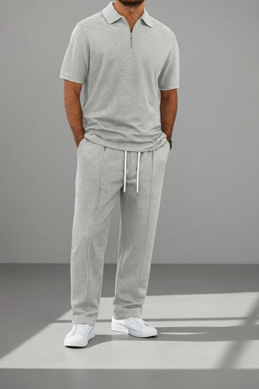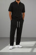 This is a stylish and comfortable monochromatic black athleisure set for men, ideal for a smart-casual or elevated relaxed look.